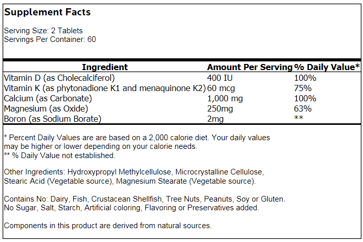 • Contains calcium, magnesium and Vitamin D, which are necessary for proper calcium absorption and utilization.