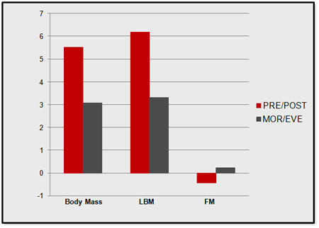 Figure 1: Training results from 23 experienced recreational bodybuilders resistance training for 10 weeks with all things (diet, supplements, training, etc.) equal except the addition of pre/post feedings. Significantly greater gains in body mass, LBM & strength were realized for the pre/post feeding subjects with a concurrent reduction in fat mass.