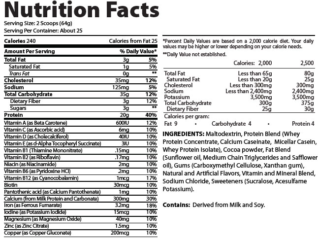 • For higher calorie intake: For pre-workout (30-45 min), add two (2) scoops (65g) of powder to at least one cup (8 oz.) of cold water or liquid of your choice. To maximize recovery after workouts or competition (within 45 min), use two (2) additional scoops (65g) post-workout.