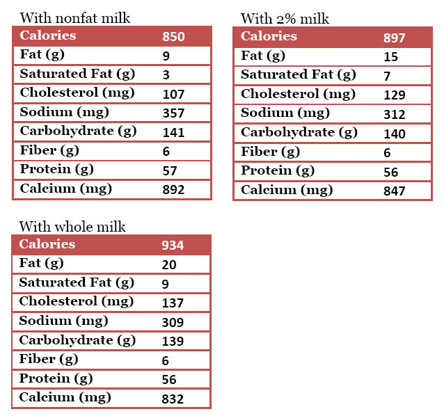 • 1  1/2 cups nonfat, 2% or whole milk (or milk substitute of your choice)