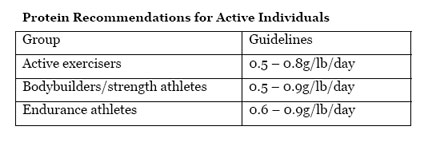 Assuming the majority of one’s energy needs are met with carbohydrates and fats, below are the current protein recommendations for active individuals.