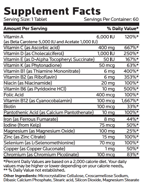 When over 50, age is more important than gender when looking for the right daily multivitamin mineral formula (MVM). As we age, our body’s needs change - especially beyond 50 years. We require the substances our bodies can no longer produce or acquire efficiently from food. Aging also alters our diet preferences, food availability and generally prevents us from getting sunshine to produce sufficient vitamin D. Generally, needs increase for Vitamins B6, B12 along with bone-building nutrients such as Vitamin D, Vitamin A (also beta carotene) and even Vitamin K for people over 50. Most adults also need a calcium supplement, but the amounts necessary do not fit into a quality MVM. Therefore, if you are not getting 1200 mg per day of calcium from food, always look for a MVM that contains little to no calcium and use a calcium supplement that contains 500 mg per tablet and use as needed. Below is an ideal MVM for the over 50 population.