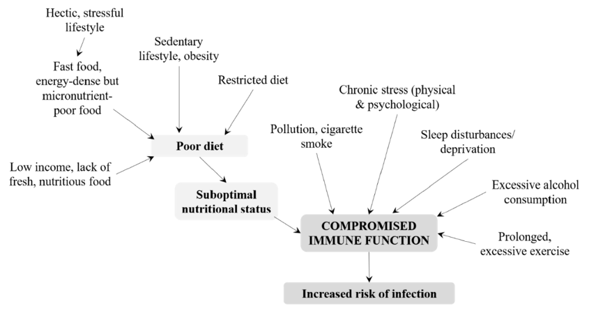 As the image above demonstrates, suboptimal nutritional status contributes to a compromised immune system and increases the risk of infection.