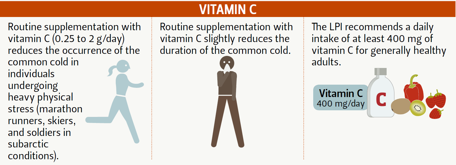 Although the RDA is 75 mg for women and 95 mg for men, routine supplementation with at least 400 mg/day for generally healthy people may help reduce the length and/or severity of symptoms for the common cold.[16]