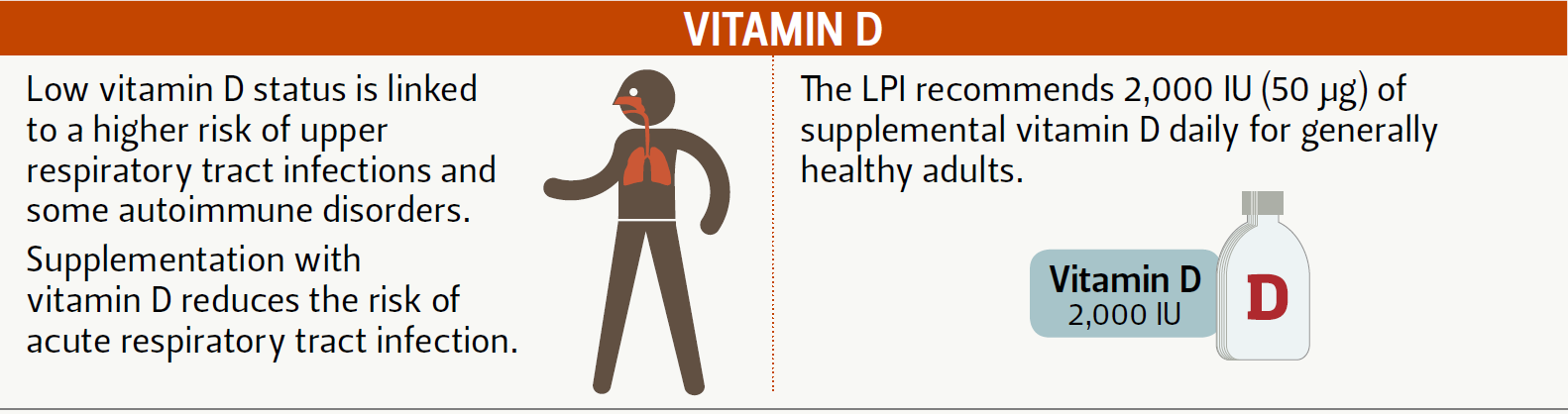 There are randomized, double blind, placebo-controlled trials on vitamin D supplements and the prevention of respiratory tract infections. One systematic review and meta-analysis of nearly 11,000 people revealed that vitamin D supplements resulted in significantly fewer participants having at least one respiratory tract infection.5  The most deficient individuals received the greatest protection and daily or weekly intake of vitamin was found to be effective compared to bolus dosing.  Furthermore, taking vitamin D supplements was found to be safe, with serious adverse events being rare and of equal occurrence between those taking supplements and those taking a placebo.