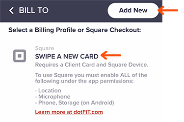 • Either click Add New to enter a billing profile to add the member's credit card information or select Swipe a New Card if using the Square device